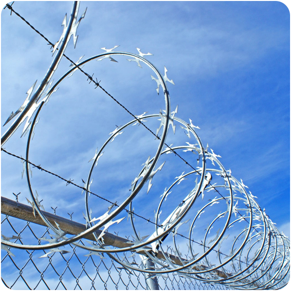 Concertina de seguridad: sistema de alambrado de acero galvanizado diseñado con cuchillas resistentes que no pueden cortarse y romperse fácilmente para darle mayor seguridad a los cercos e impedir el paso de personas en áreas restringidas.